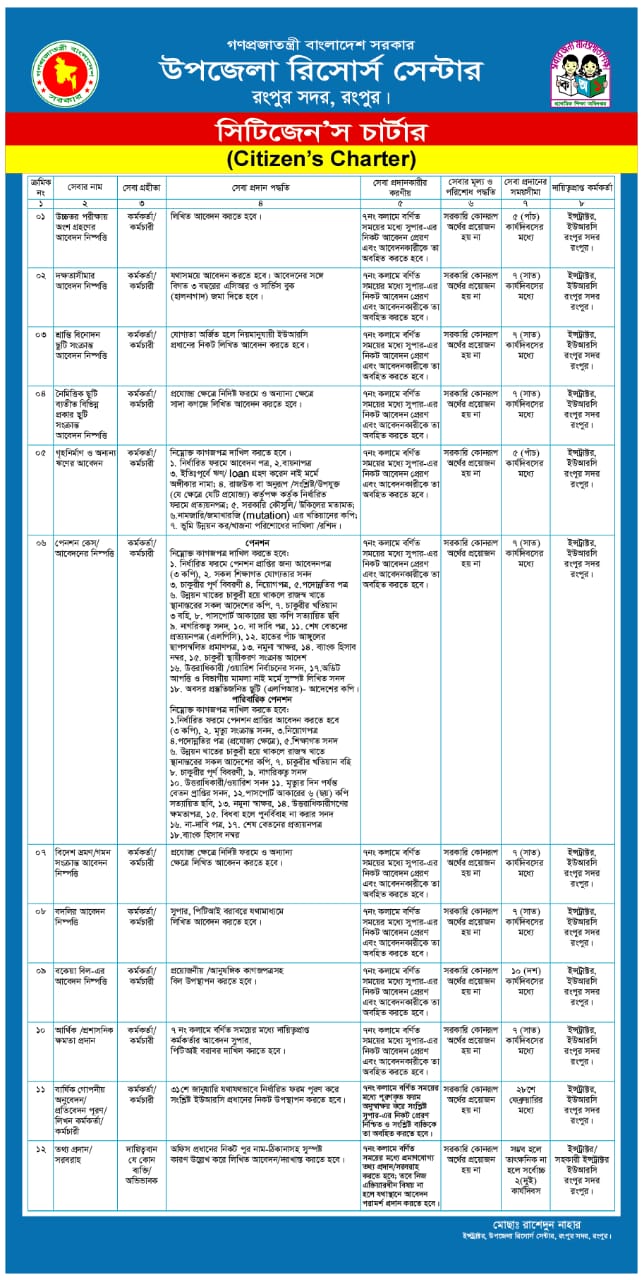 | ক্র: নং | প্রদেয় সেবা | সেবা গ্রহীতা | সেবা প্রাপ্তির জন্য করণীয় | সেবা প্রদানকারীর করণীয় | কার্য সম্পাদনের সময়সীমা | মন্তব্য |